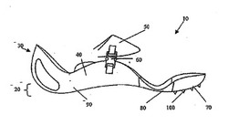 つま先部分70およびインステップ・かかと部分90は、堅く、実質的に不撓性の材料から作製される。運動競技において経験する通常の力を受けてその形が実質的に変化しない材料というのが、堅く、実質的に不撓性の材料の意味である。この材料は、合成材料であり、かつ、一例において、炭素繊維シートを含む。炭素繊維シートは、熱可塑性エポキシ樹脂に埋め込まれた炭素繊維から作製される。本発明の好ましい態様において、つま先部分70およびインステップ・かかと部分90とも同じ材料から作製されるが、それらは異なる材料から作製されてもよい。