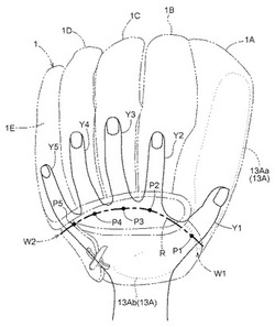 【解決手段】補給面を備えた手袋状の外皮の内部に指袋を設けてなるグローブ本体1のうち、母指挿入部1Aに挿入された母指Y1のMP関節P1に相当する部位又は小指挿入部1Eに挿入された小指Y5のMP関節P5に相当する部位若しくは前記両指Y1,Y5のMP関節P1,P5に相当する部位に、捕球面側への折り曲げ操作抵抗を低減する脆弱部W1,W2を設けてある。
