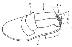【解決手段】 コの字型の可撓性板状物質(1)下部の2つの外側部位(2)および(3)と2つの内側部位(4)および(5)で構成する面を、(2)と(3)、(4)と(5)が共に距離を近づけるように部分円状に曲げ、上部の一方の先端稜部(6)と(2)および(4)で構成する面並びにもう一方の先端稜部(7)と(3)および(5)で構成する面を、(6)と(7)が距離を遠くするように、共に部分円状に曲げた反発弾性発現型成形物を靴の開口部分(9)の後部に密着させた靴ベラ不要靴である。
